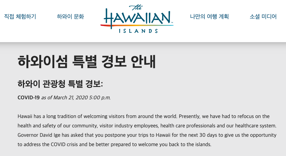 하와이 관광청 특별 경보: COVID-19 as of March 21, 2020 5:00 p.m. Hawaii has a long tradition of welcoming visitors from around the world. Presently, we have had to refocus on the health and safety of our community, visitor industry employees, health care professiona