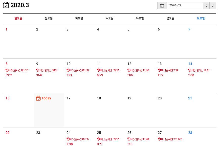 우선 3월의 날짜별 바닷길 시간입니다. 스케줄 확인하세요!